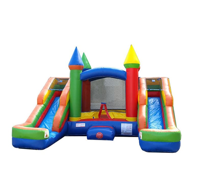 Unbeatable Fun with the 16x15 Boys Multi-Color Dual Lane Wet/Dry Castle Combo with Hoop and 2 Slides and Pools!