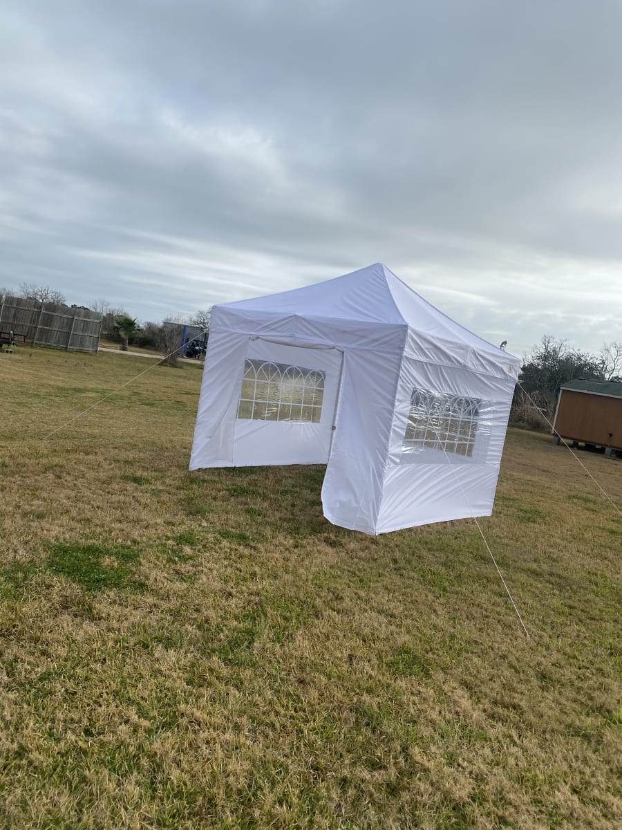 This is our 10x10 enclosed commercial pop up tent. It is designed for both indoor and outdoor use. It measures 10 feet wide and 10 feet long, providing ample space for various activities such as camping, outdoor events, and trade shows. The tent features windows and walls that fully enclose the interior, offering protection from the elements such as wind, rain, and sun. The tent is made from durable materials, such as waterproof fabric and sturdy metal poles, ensuring it can withstand various weather conditions. The enclosed design allows for privacy and a controlled environment, making it suitable for a wide range of activities.This Tent can be setup virtually anyway on grass or even hard surfaces. Lights can also be added at an additional cost.